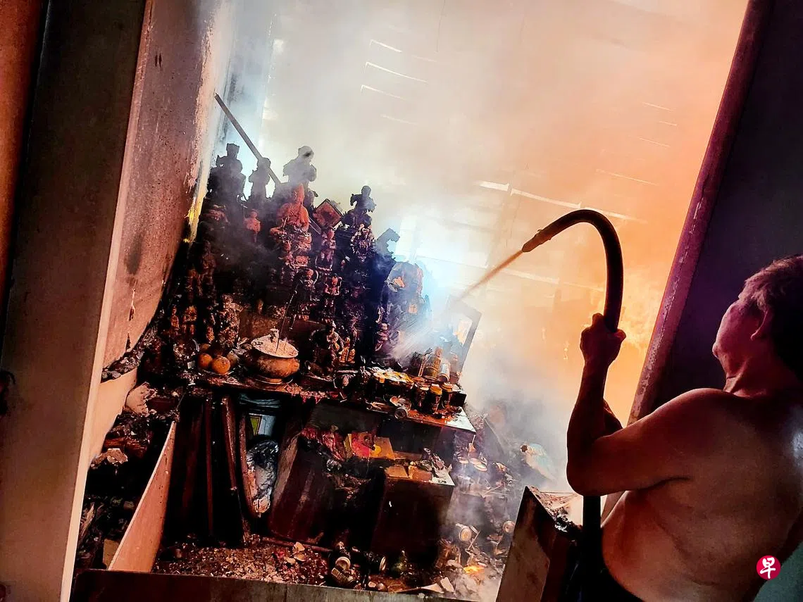 根据读者提供的画面,寿板店二楼正不断冒出白烟,至少两辆大型消防车和10多名民防人员正在灭火。火势主要集中在二楼一个祭坛,成堆神像在火患中被烧得焦黑。除了神像,二楼也堆放不少杂物。