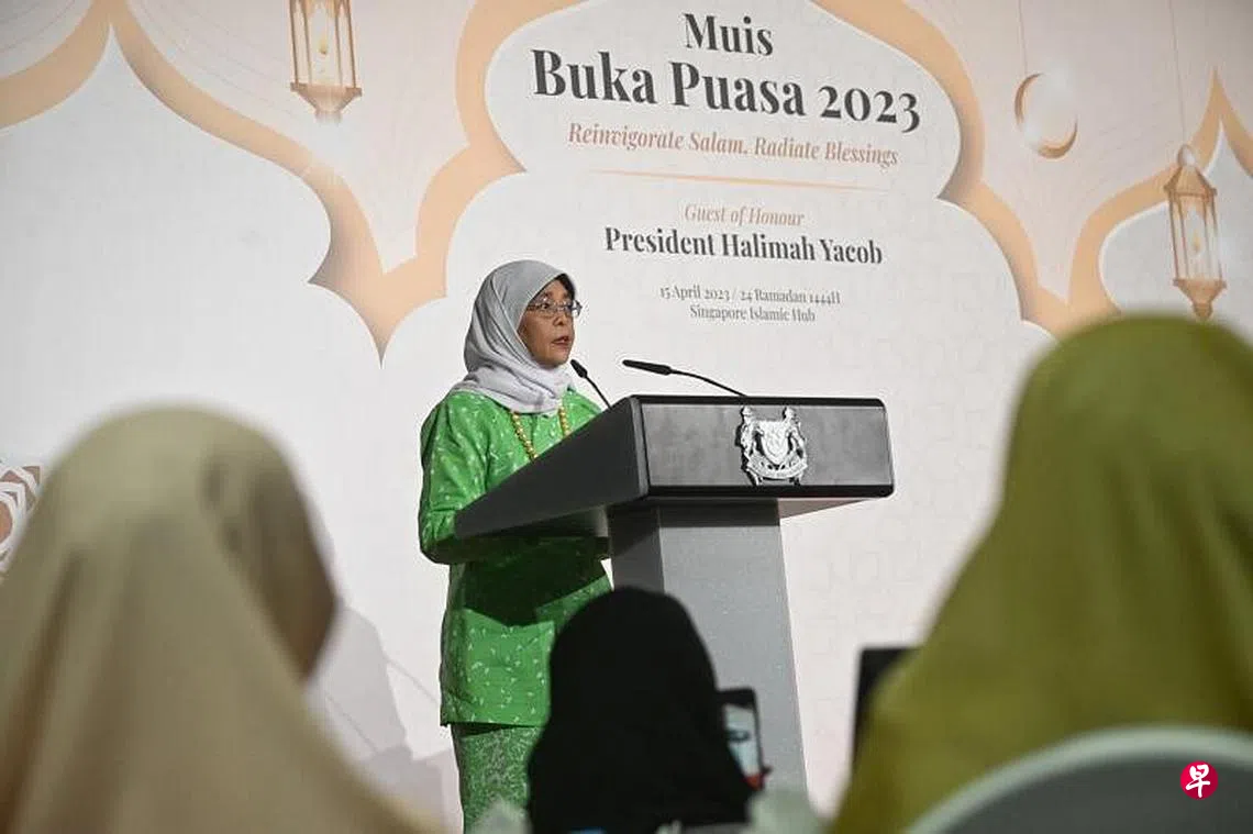 哈莉玛总统星期六(4月15日)傍晚在布莱德路新加坡回教综合大厦(Singapore Islamic Hub)同大约100名社区和宗教领袖,以及回教救济金(Zakat)与慈善福利院的受益者一起享用开斋饭食。