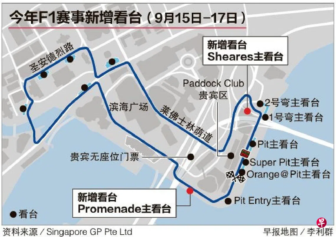 F1大奖赛主办方指出,今年由于滨海湾的部分主看台须关闭重建,看台座位因此减少,新增两个主看台区可缓解座位供不应求的问题。