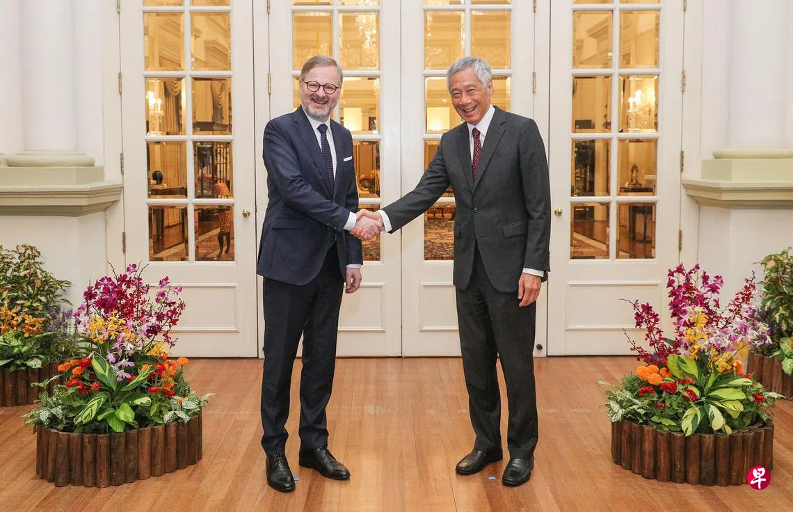 捷克总理菲亚拉(Petr Fiala)星期四(4月20日)在总统府会见哈莉玛总统和李显龙总理。