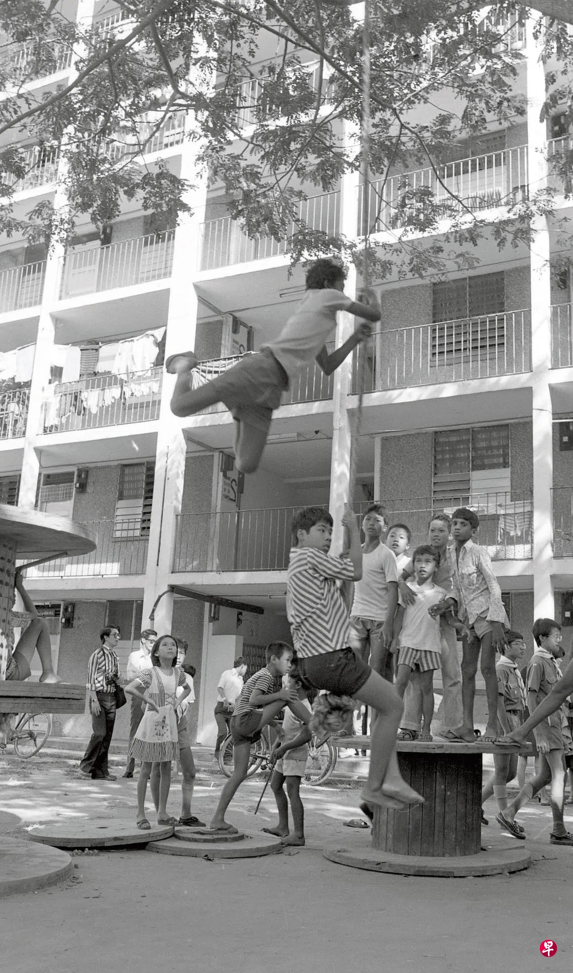 旧时组屋楼下的儿童游乐场,由木桩和石板组装而成,高处还悬挂着麻绳编织的长长绳索。活泼的孩童攀上绳索晃荡玩乐,地面上观望的孩子则纷纷露出艳羡的目光。