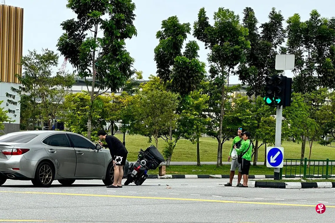 据现场公众拍下的照片,涉事银色轿车的右边车头撞上送餐员的代步工具后,附近一些送餐员和公众见状也上前查看和帮忙。
