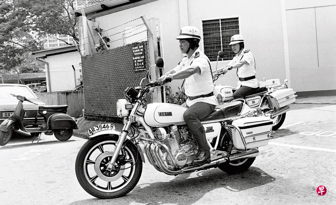 1979年,交通警察骑在大型雅马哈(YAMAHA)电单车上,身着制服,英姿飒爽。