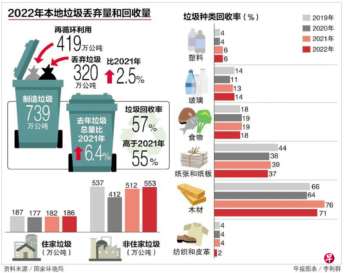随着经济活动复苏,我国去年的垃圾丢弃量超出了冠病疫情暴发前的水平,但回收率却不及疫前,其中住家垃圾的回收率下降至10年多以来的新低。建筑和拆建活动恢复,也导致工业垃圾产量和回收量都显著增加。