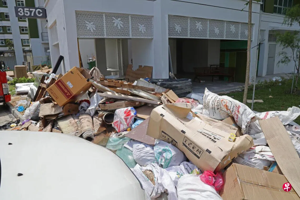 乌美新组屋垃圾槽前堆满装修垃圾,甚至堆放到组屋走道,还因此引发火患,导致电梯口的天花板被烧。