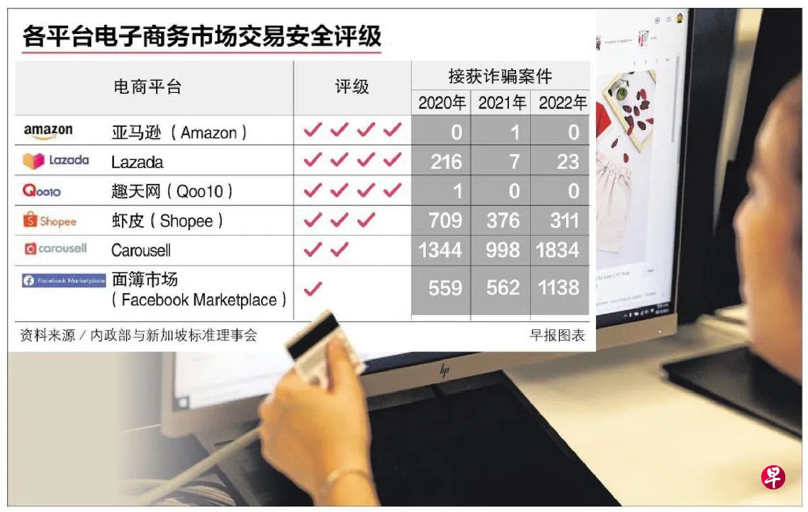 内政部打击诈骗跨部门委员会星期四(5月4日)发布2023年电商市场交易安全评级(E-commerce Marketplace Transaction Safety Ratings)。参与的六个电商平台都维持去年的评级,从高至低依次为获得四个勾的亚马逊(Amazon)、Lazada和趣天网(Qoo10)、三个勾的虾皮(Shopee)、两个勾的Carousell,以及一个勾的脸书市场(Facebook Marketplace)。