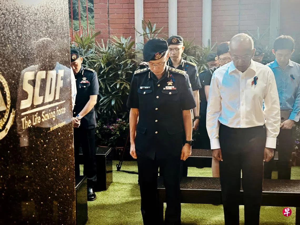 纪念园的矩形大理石纪念碑刻着两名已故民防人员的名字。他们分别是于去年12月8日执行灭火任务时不幸殉职的吴宏泽一级上士,以及2006年1月19日在前往执行任务时半途发生车祸牺牲的沙易阿曼上士。