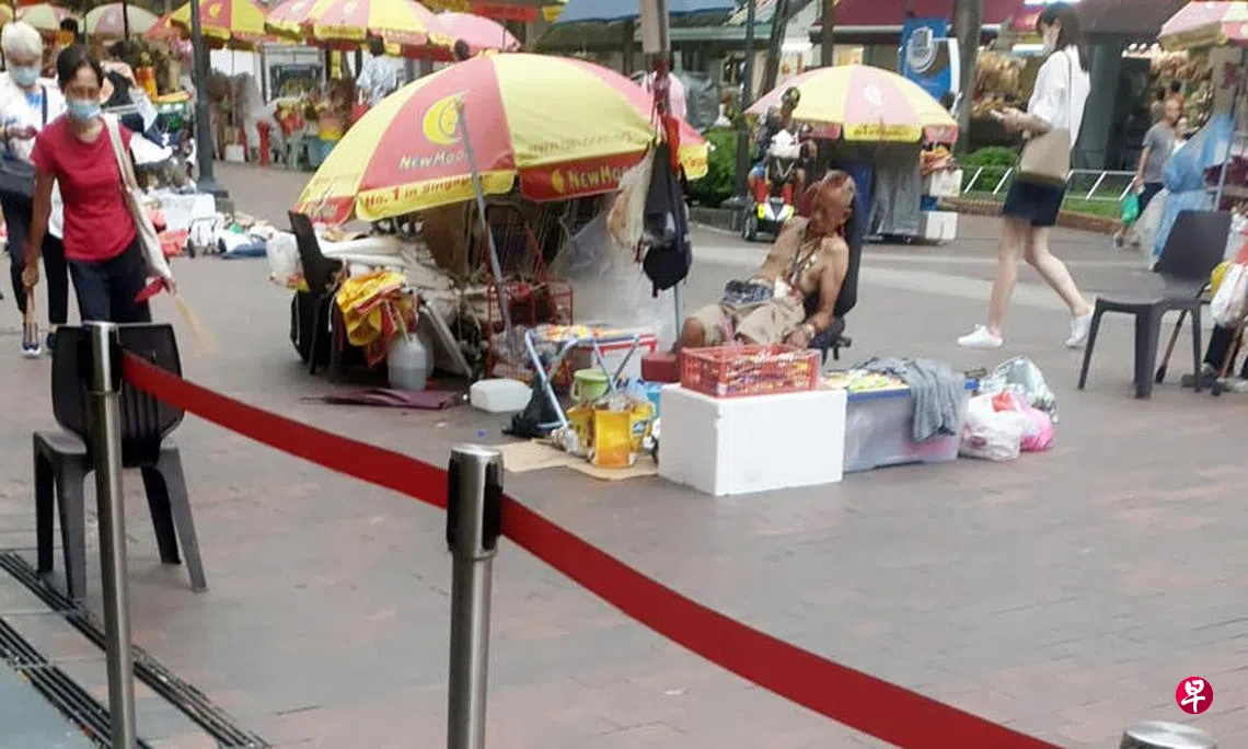 阿叔在四马路观音堂外摆摊卖纸巾和糖果,被指裸露上身、抓下体,还大骂不买纸巾的香客。