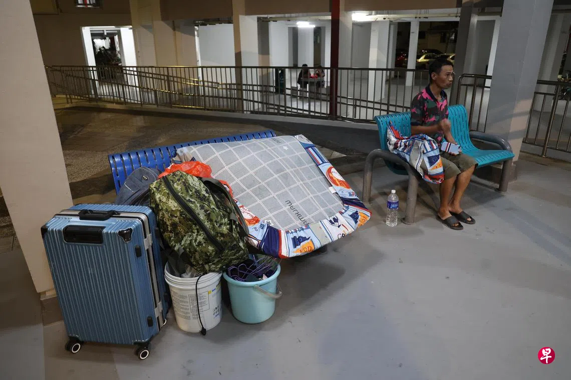 记者星期天(5月7日)走访现场时,发现客工陈友红(46岁)带着大包小包的行李,愁眉不展地躺在组屋楼下的长凳上。