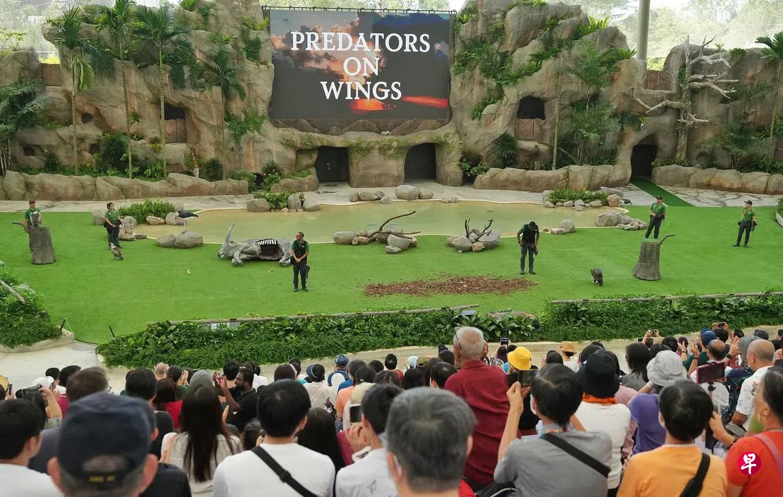 开放首日,访客在飞禽公园的天际剧场观赏首场猛禽表演(Predators on Wings)和展翅高飞表演(Wings of the World),壮观的飞禽演出赢得访客阵阵掌声。