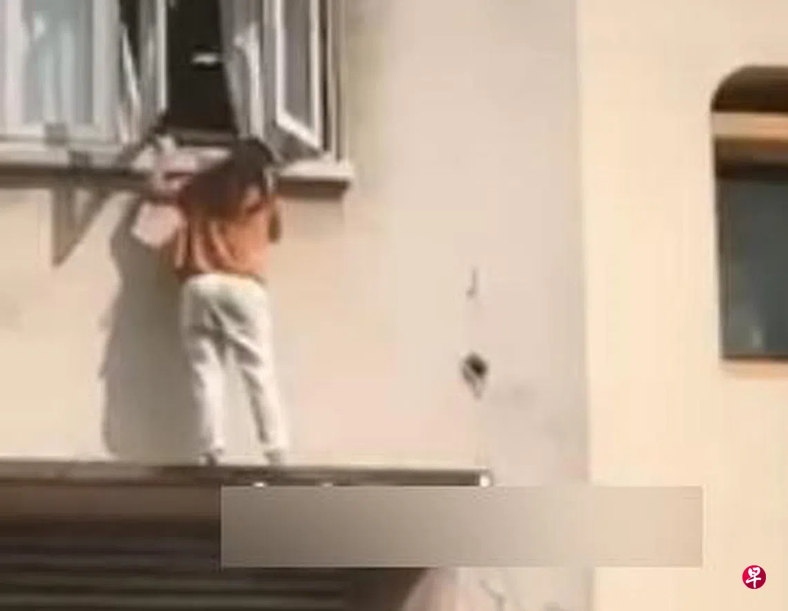 根据她拍下的视频画面显示,女子当时双手握住窗台,身上并未系带任何保护绳索与工具,场面看起来相当惊险。