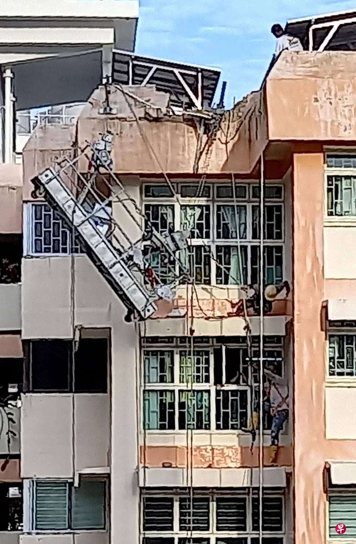 两名工人在文礼一座组屋准备清洗外墙时,用来支撑吊篮升降系统的一堵楼顶外墙突然坍塌,导致吊篮瞬间倾斜。所幸千钧一发之际,工人佩戴的安全配备发挥作用,两人先后获救送院,现已出院休养。