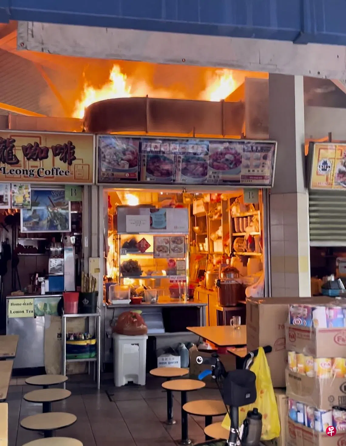 马西岭巴刹与熟食中心一鱼汤档的员工在油炸蛋丝时,位于油锅上方的排油烟管突然烧了起来,整个摊位火光熊熊,火势一度还沿着排油烟管蔓延。在场约40名摊贩和食客自行疏散,鱼汤档一名男员工则被热油溅到,受伤送院。