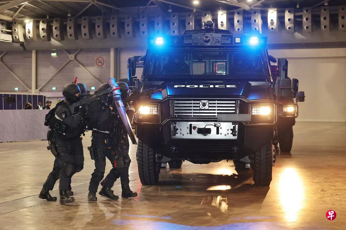 上述情景是新加坡警察部队星期五(5月12日)在工作计划研讨会上搬演的片段,隶属特别行动指挥中心的战术反击车(Tactical Strike Vehicle)也在演练中初次亮相。