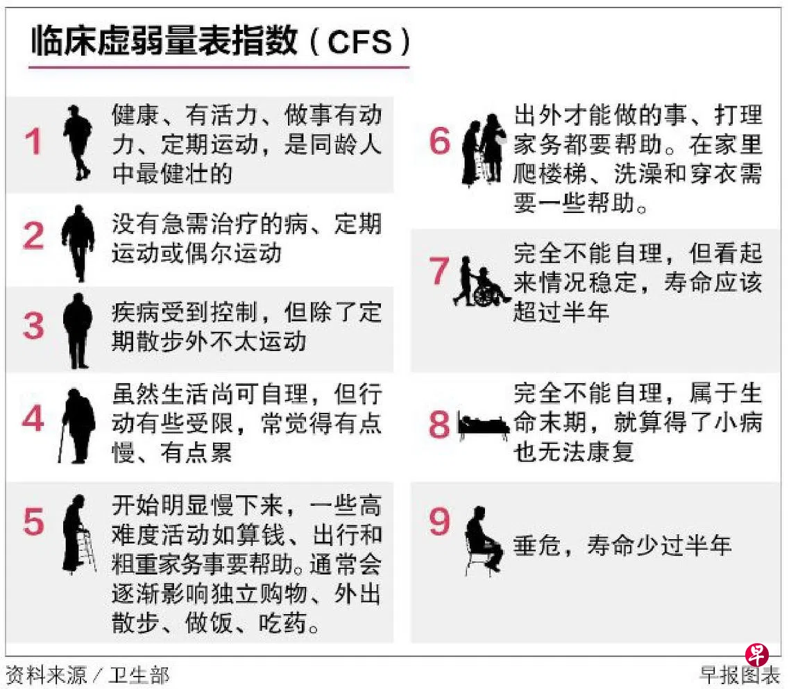 1到3的年长者属于身强体壮的组别,可通过运动、社交、饮食和慢性疾病管控等方面维持或改善身心健康。指数介于4到6的年长者属于虚弱组别,需要专科和看护资源。指数介于7到9的严重虚弱或身患绝症年长者则更需要社会心理、专科或临终护理资源。