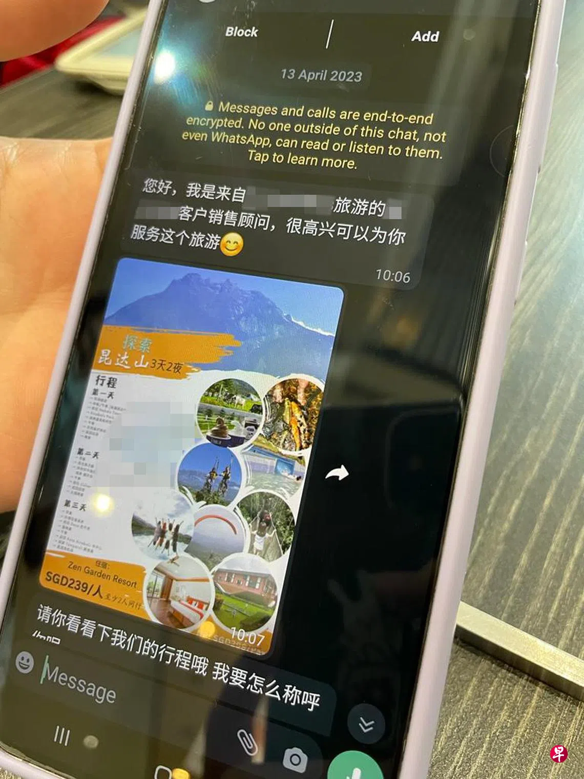 詹女士受访时说,她在4月份的时候,看中一则旅游促销广告,通过WhatsApp联络了一名自称为Alvin的销售顾问。