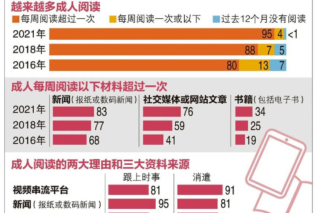 不过,喜欢阅读的本地学生却进一步减少,称非常喜欢阅读的学生比率在2021年下降至51%,是10年来新低,这一比例在2016年和2011年分别为55%和60%。父母认为孩子非常喜欢阅读的比率,也分别从之前的53%和60%,下降至2021年的48%。