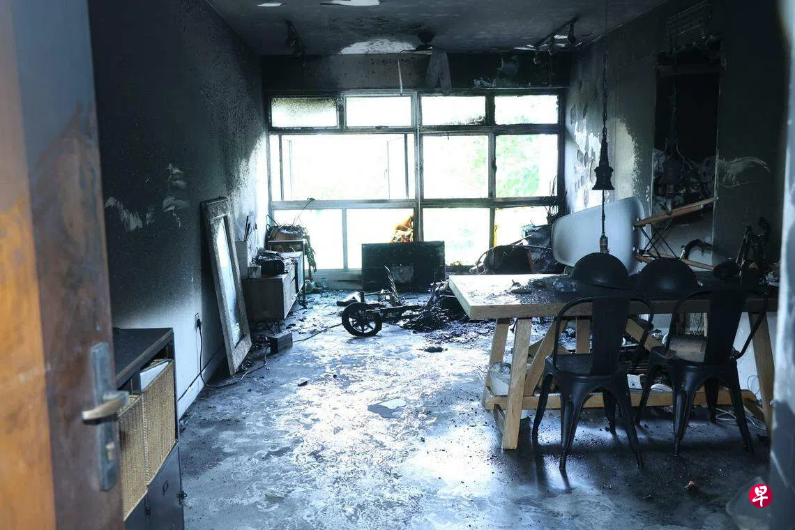《联合早报》记者星期四早上10时30分左右抵达事发地点,事发组屋外墙被熏黑,散发阵阵烧焦味;有居民忙着擦拭门窗,市镇理事会人员也上门了解情况。事发单位铁门已上锁,里头有一辆被严重烧毁的电动脚踏车。
