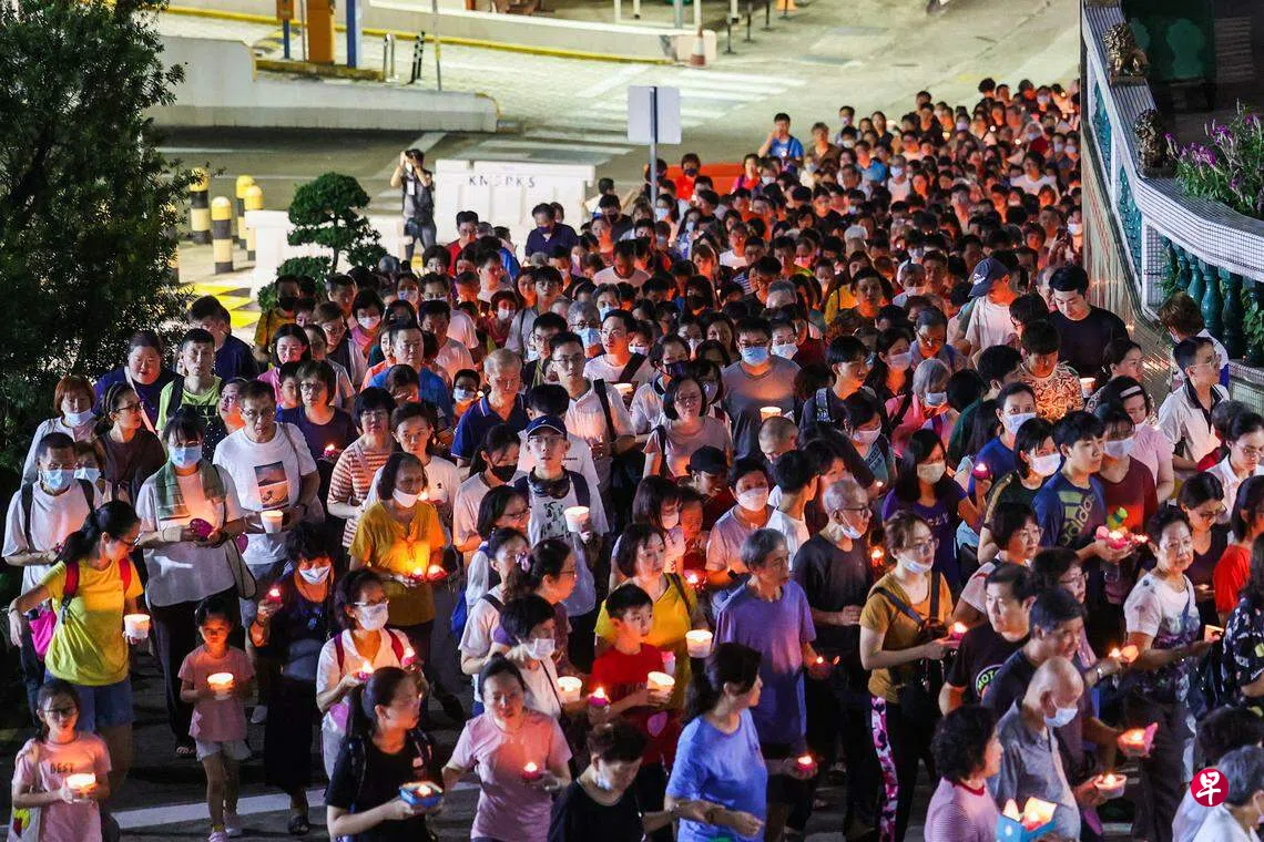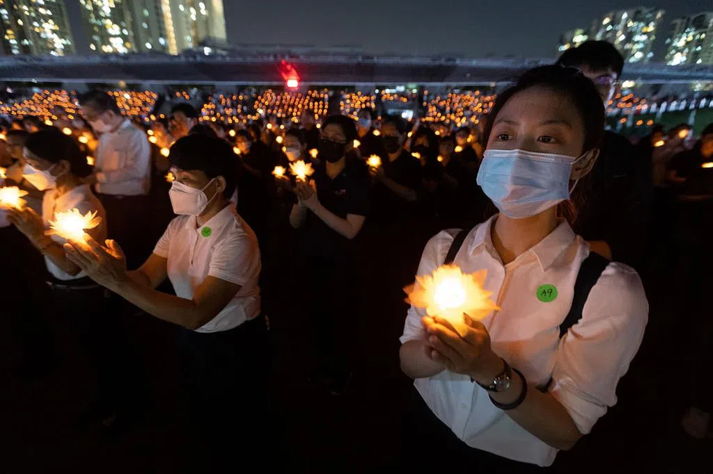 星期六(5月20日)晚上,近4000人一同点亮了手上的莲花灯,瞬间在光明山普觉禅寺形成一片灯海,场面十分壮观。