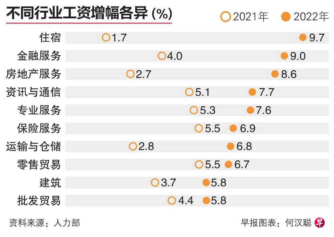 各行各业逐渐走出冠病疫情阴影,带动本地经济复苏和工资上涨。相比2021年,去年所有领域都取得较高的工资增长,但增幅因行业而异。其中以住宿业工资增幅达9.7%居冠,其次是金融服务(9.0%)及房地产服务(8.6%)。