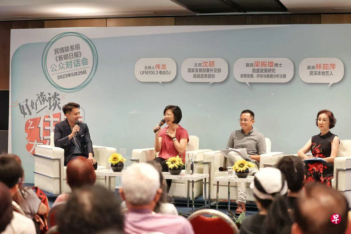 沈颖星期一(5月29日)出席民情联系组(REACH)与《新明日报》联办的《好好谈一谈之住屋大件事》对话会,连同凯度公共政策咨询新加坡(Kantar Public Singapore)政策发展、评估与数据分析主管梁振雄博士、资深艺人林茹萍及105名现场观众,共同探讨政府组屋、社区生活等课题。