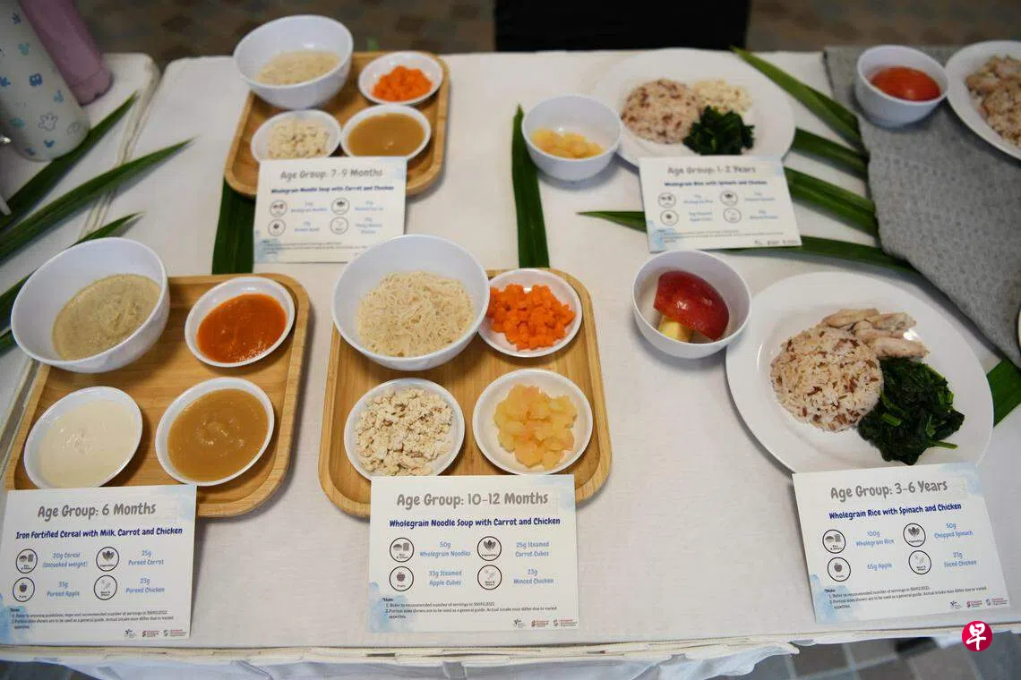 在新指南发布会现场,有关单位展出了根据新指南准备的餐食样品,有适合六个月婴儿的流食、10至12个月幼儿的切碎食物、三至六岁孩童的糙米饭等。