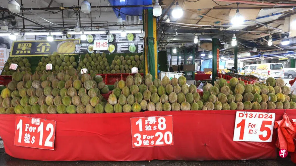 两元一个、10元三个!名种榴梿降价出售,芽笼一条街五个榴梿摊“大平卖”,受访摊贩指马来西亚榴梿老树和新树都开花,供应量充足,才便宜甩卖。