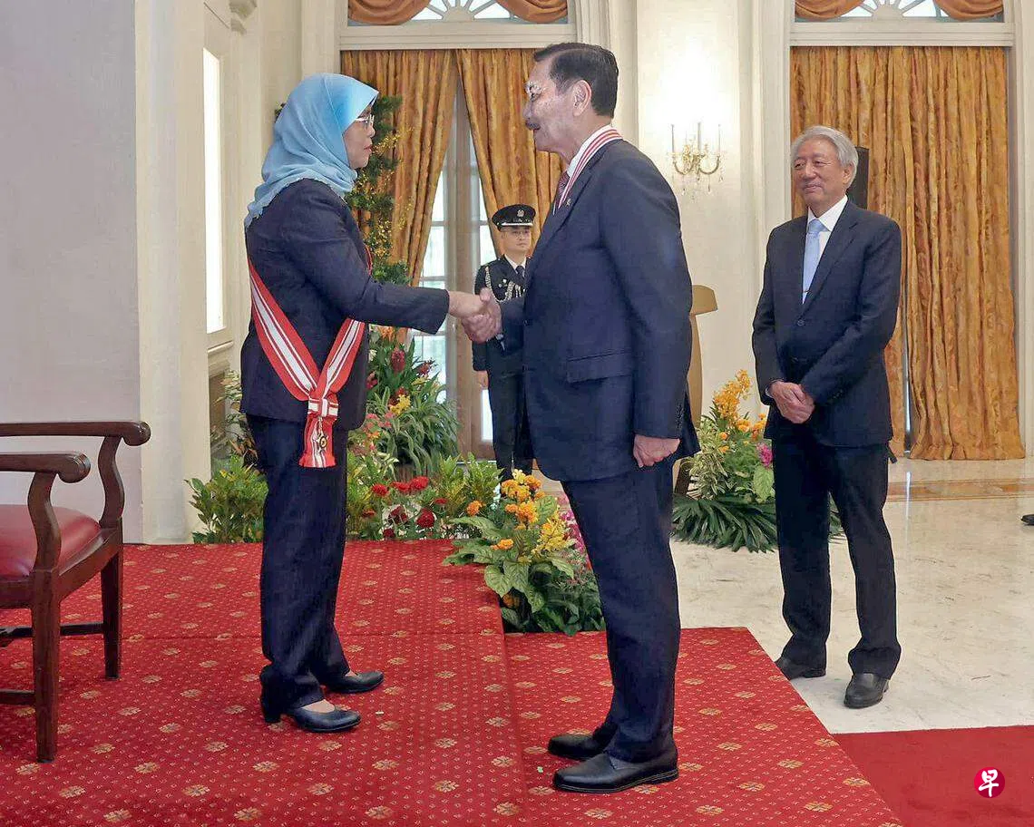 印度尼西亚海洋与投资统筹部长卢胡特星期一(6月5日)获哈莉玛总统授予殊功勋章,以肯定他对促进新加坡和印尼双边关系所做的重要贡献。