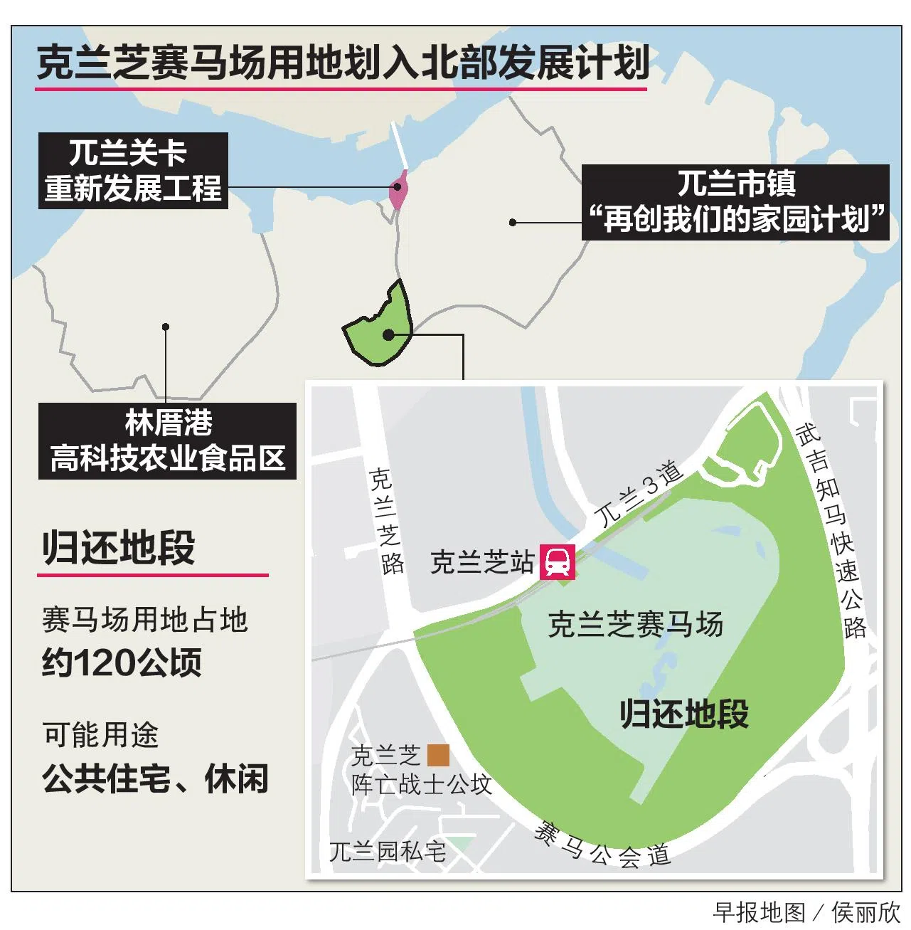 克兰芝马场土地归还政府后,将释出面积约200个足球场大小的地段供重新发展,这包括马场占用的大约120公顷土地,以及周边一些零星的国有土地。