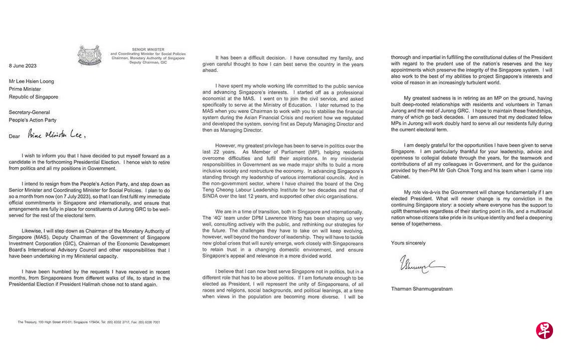 我打算退出人民行动党,并卸下内阁资政和社会政策统筹部长的职务。 我计划在一个月后(2023年7月7日)这么做,因为我得先履行对新加坡和国际上的正式承诺,以及做出充分的安排,确保在剩余任期内,裕廊集选区的选民能得到妥善的照顾。
