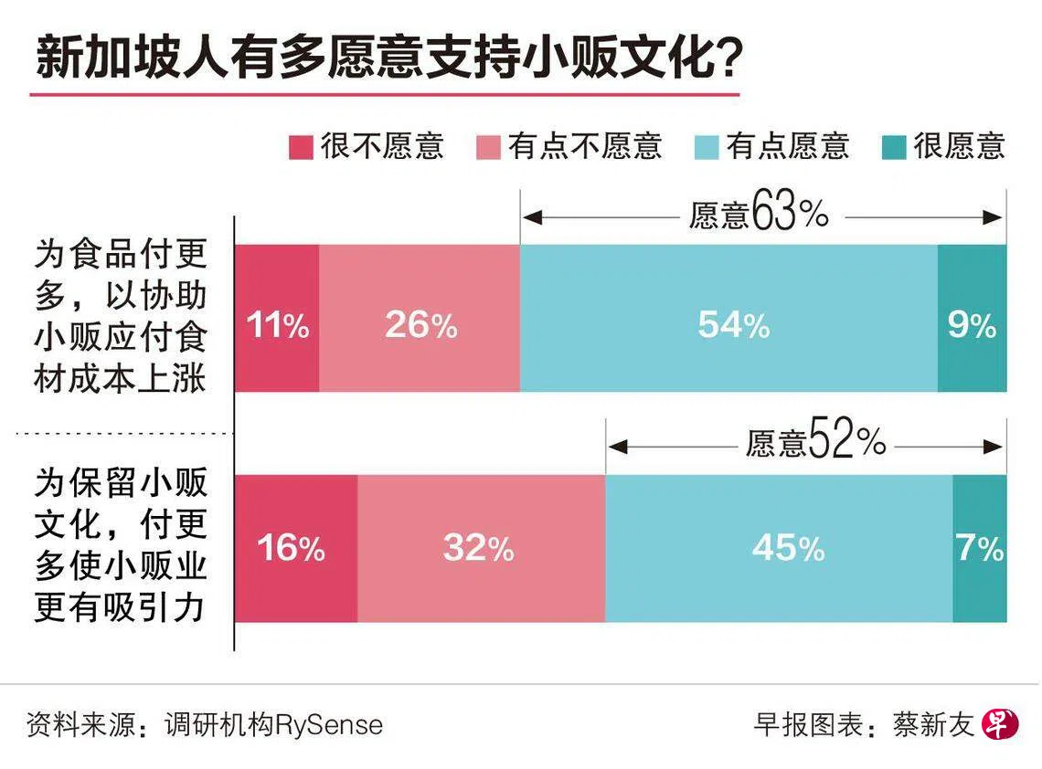 为了保留小贩文化,超过六成的受访者表示愿意为小贩食品付更多钱,以协助小贩应付食材成本上涨,而一半的受访者甚至愿付更多,好让小贩行业更具吸引力。