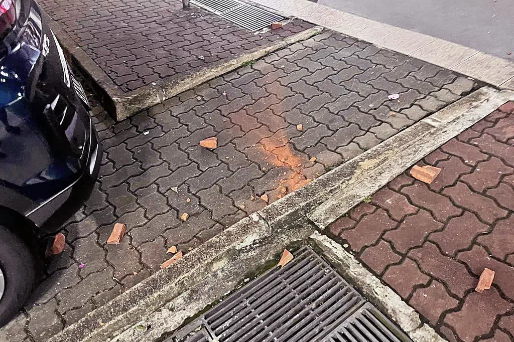 “砖块落地后,碎片洒满走道,这些碎片很锋利,若真的砸到人,肯定会危及生命。由于我赶着上车,之后便叫父亲帮忙在群组里提醒居民。”