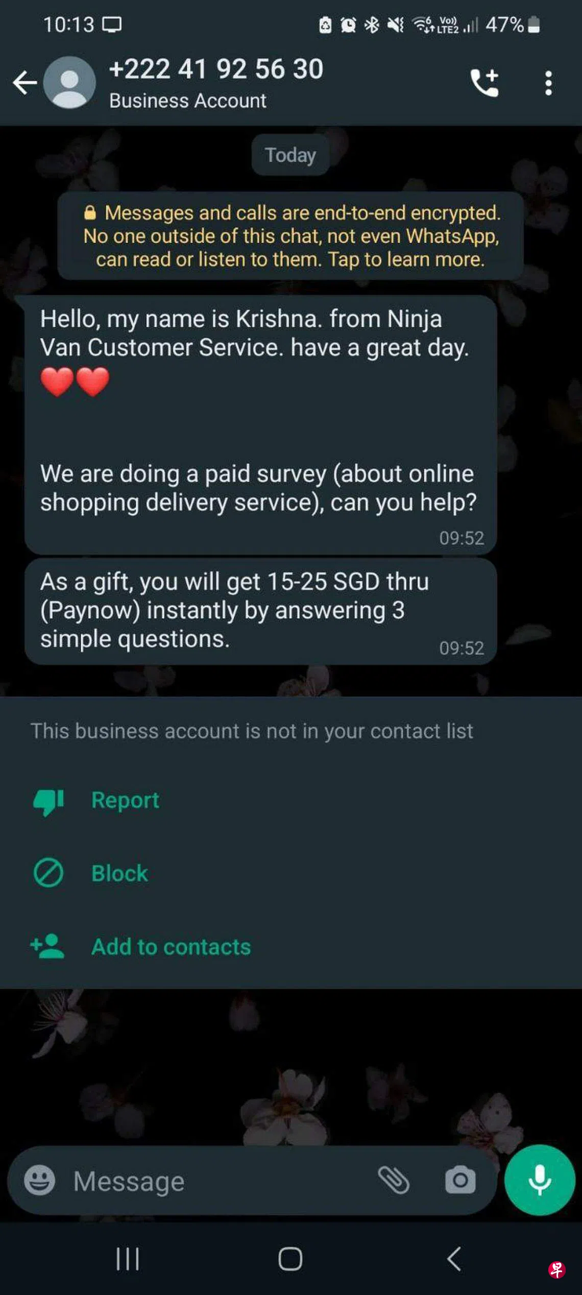 能者快递透露,一名公众在6月6日收到冒充该公司发出的WhatsApp有偿问卷调查。完成问卷调查后,冒充者就要求这名公众转向通讯应用Telegram与另一名工作人员联络。在Telegram上,冒充者借口要以PayNow转账15元现金奖励,要了该公众的手机号码,接着又进一步诱使他加入一个Telegram群组,以继续参加其他问卷调查。