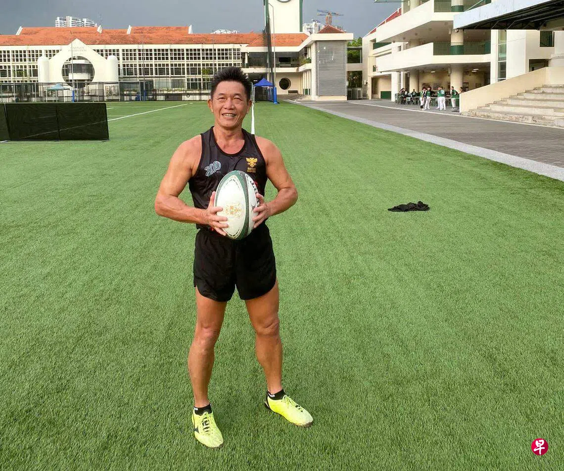 每个星期天早上7时,丁元豪都会回到母校莱佛士书院,与20多个校友一起练习英式橄榄球。大家是为了7月下旬的一场与圣安德烈中学校友的年度橄榄友谊球赛做准备。在这批大约30多岁至50岁的校友中,丁元豪虽然是年纪最大的,但他的体能和灵活度却一点不输学弟们。曾有一回,丁元豪上午与其他朋友跑完了10公里,下午就参加与学弟们的橄榄球切磋赛。