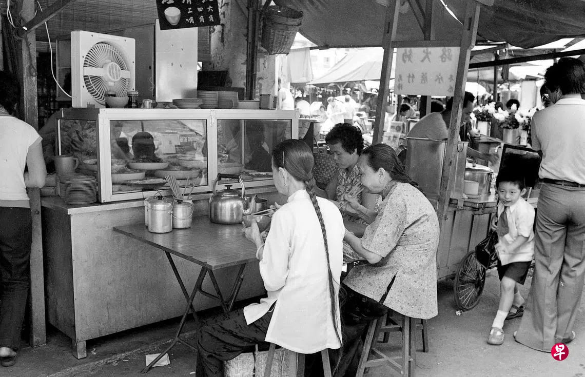 两年前被联合国教科文组织列为“非物质文化遗产”的本地小贩历史悠久,图中几位妈姐1983年初正在牛车水街边摊位用餐。