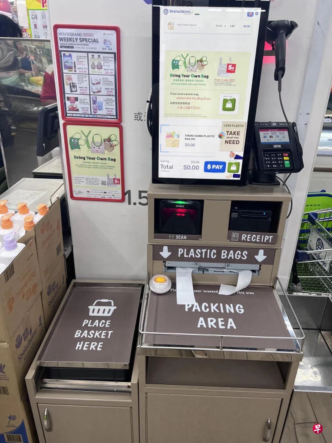 昇菘超市目前已在五间分店推出设有分发塑料袋装置的自助付款机,随着7月3日起要征收一次性的塑料袋费用,为配合新规定,顾客届时只需点击屏幕获取塑料袋,系统将自动计算分发数量及费用。