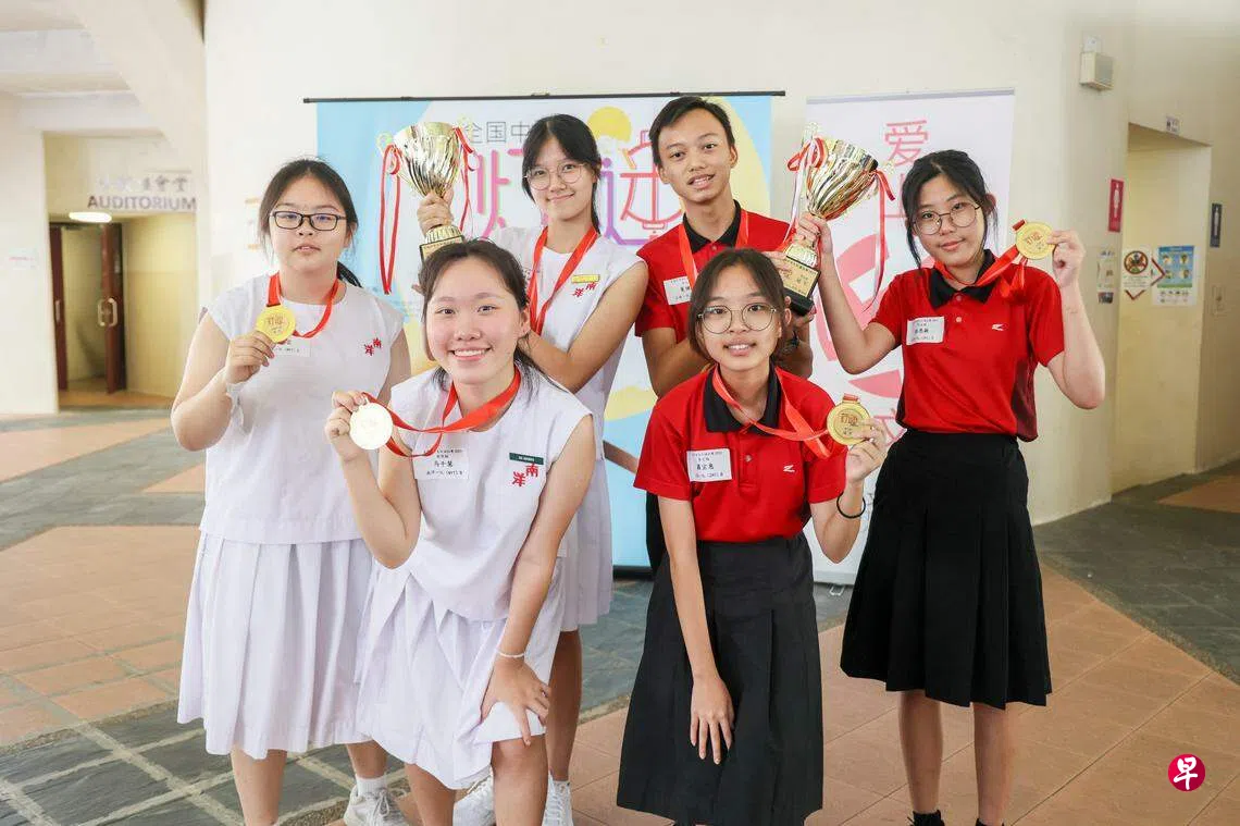 正华中学一队和南洋女子中学一队的学生,分别获颁本届比赛华文组和高华组冠军。