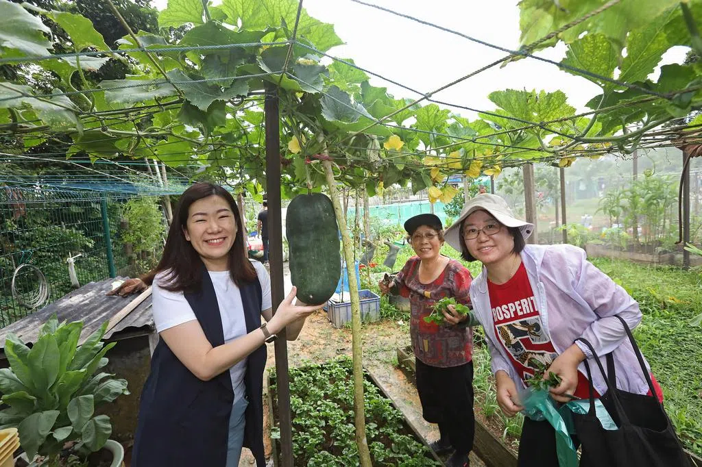 国家发展部长李智陞星期天(6月25日)走访坐落在裕廊西65街第673座多层停车场顶层的租用园地(allotment garden),与居民一同收割冬瓜、黄瓜和长豆等农作物,并现场烹调。