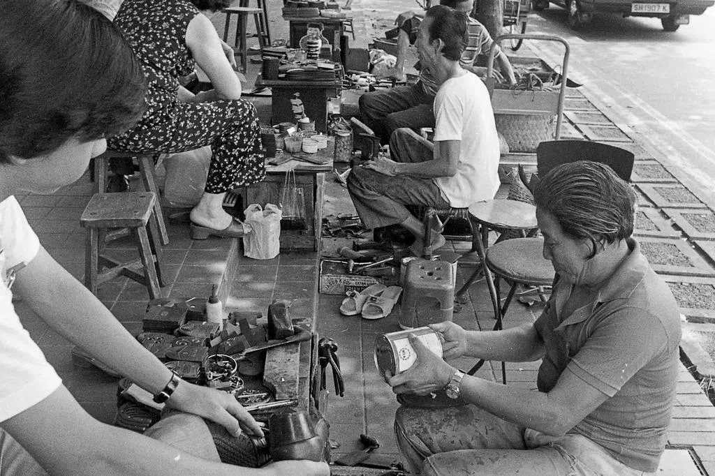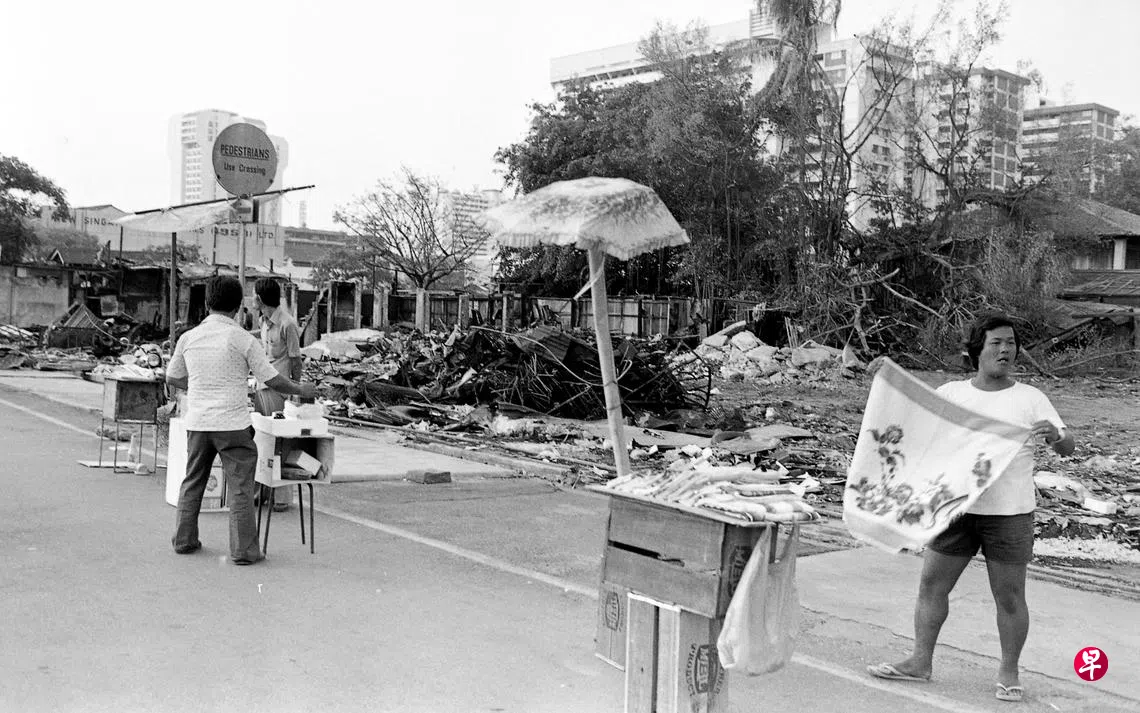 1982年国庆日后的第二天,稽查员便前去拆了摊位。当时受影响的摊贩有100多个,有31名旧货商因为行业性质关系,获颁准证继续在双溪路(结霜桥的正式名称)营业。照片为1983年3月的结霜桥,三名小贩继续在这里叫卖。