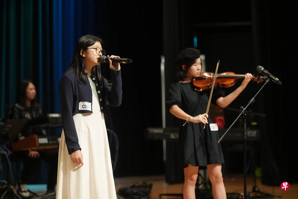 除了创作类之外,比赛还有独唱和合唱两个组别,演绎往届获奖作品或指定新谣曲目。德明政府中学的华文教师蔡姗珊(40岁)带着学生林欣儒(13岁)和袁乐蒽(13岁)组成“林蔡袁”小组参赛,通过独特的“上课了”开场白吸引观众眼球,还挥手带动全场互动。