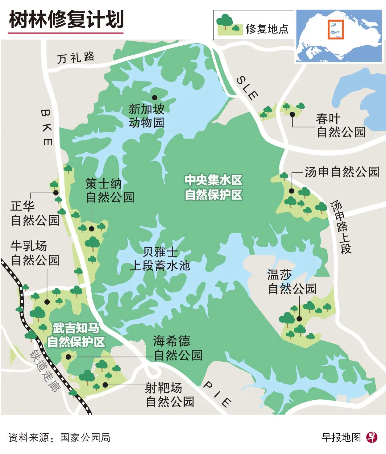 配合自然保育总蓝图,公园局在2019年推出树林修复计划,要在10年内,于中央集水区和武吉知马自然保护区周围的缓冲园区种下多25万棵树。