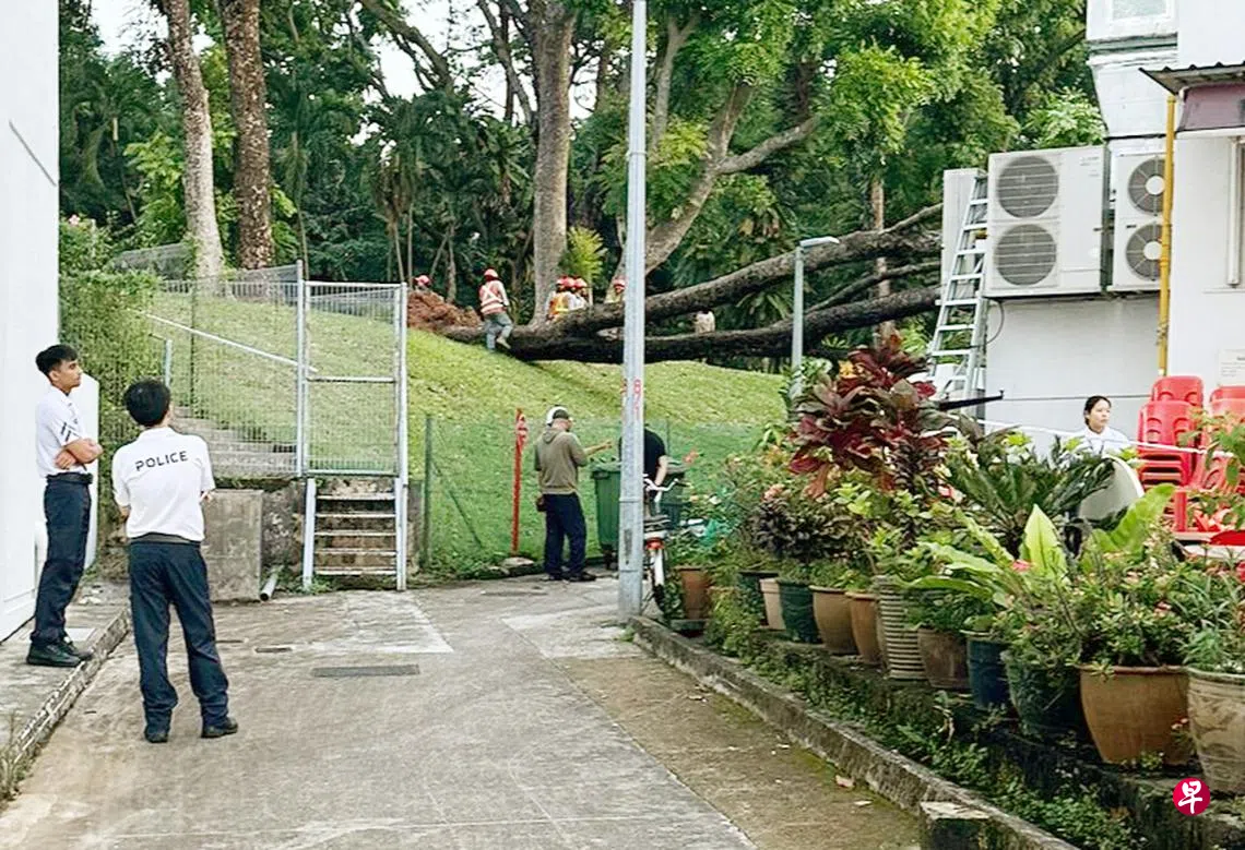 中峇鲁30年老树突然断裂倒下,砸坏一旁的咖啡座冷气槽和屋顶。为确保民众安全,当局派人到场,将毗邻的另外三棵大树也一并砍下。