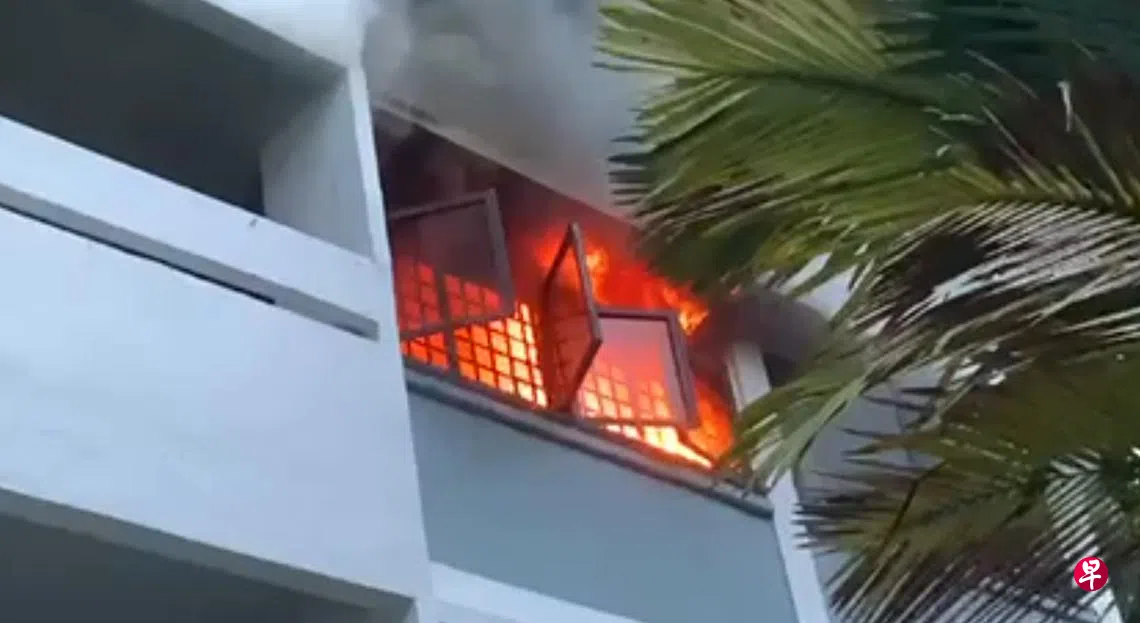 疑神台酿火患,组屋单位起火狂烧,夫妻两受困火海,民防部队迅速破门救人。