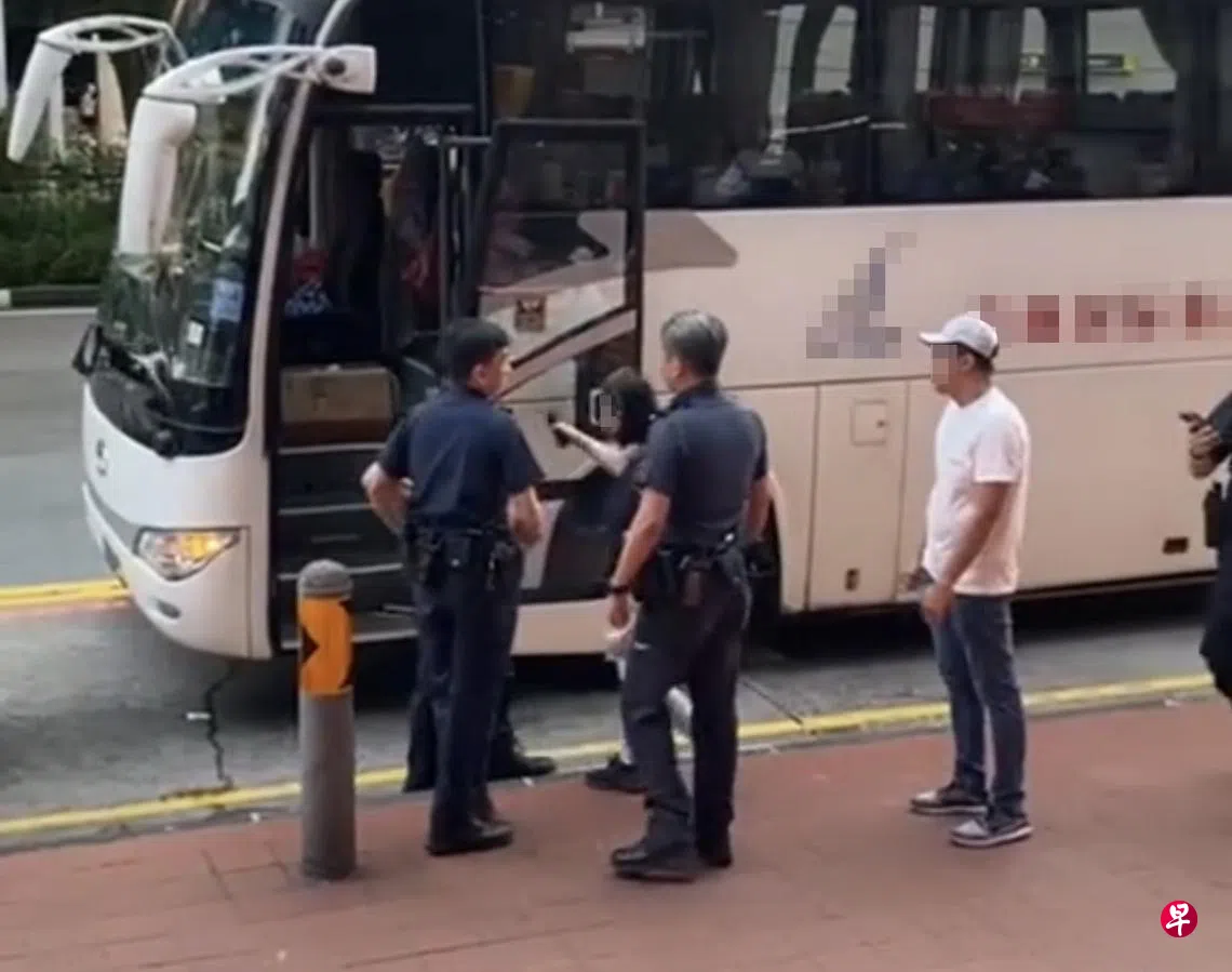根据社交媒体流传一段视频显示,一辆旅游巴士停在珍珠大厦前,附近还有数辆警车,路旁也有数名警员在场调查。当时,一名身穿白色上衣以及深色短裤的阿叔被警员上了手铐后,随后被带上了警车。