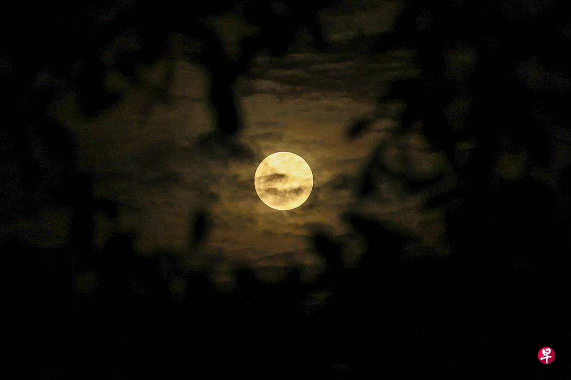 《联合早报》记者晚上8时抵达滨海堤坝,虽然天空多云,但依然能清晰地看到云中又大又圆的雄鹿月。