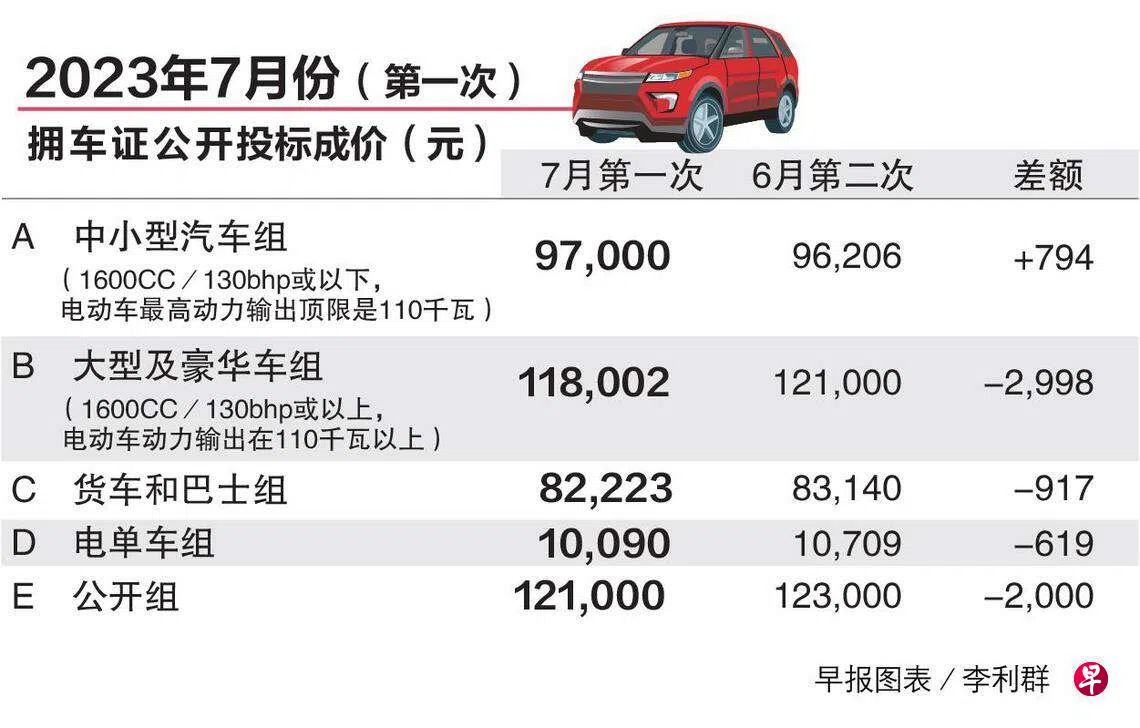本月第一轮拥车证公开投标活动星期三(7月5日)下午结束。应付大众市场需求的中小型汽车组(A组)拥车证成价上涨794元(0.8%),报9万7000元,是本轮投标活动中唯一上涨的车组。