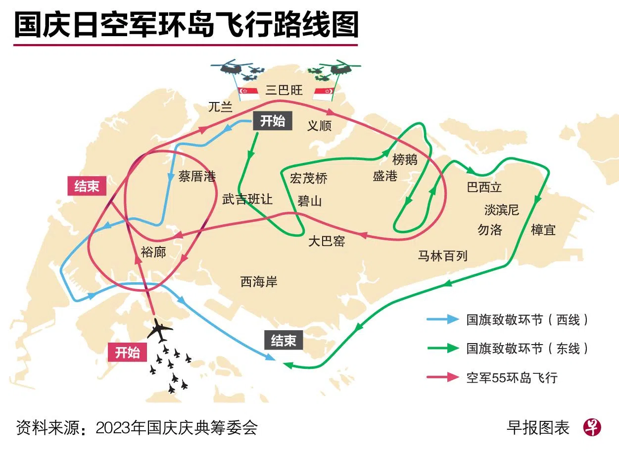 迈入第四个年头的国旗致敬环节(Fly Our Flag),将在国庆日当天傍晚5时30分至6时30分进行。两架悬挂巨型国旗的CH-47SD型契努克直升机,各由两架AH-64D型阿帕奇攻击直升机伴飞,分别按照东、西两条路线,将巨型国旗带进邻里。