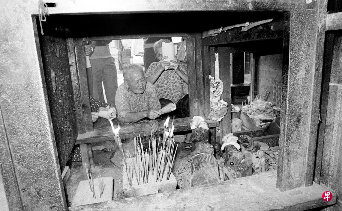 1984年的照片中有一张大神桌,桌子底下放了几只泥塑的老虎,也就是华人十分崇敬的“虎爷”。面向镜头的两位老妇人是替人祈求的“灵媒”,除了替人伸冤打小人,请“虎爷”驱魔镇邪的也是她们。
