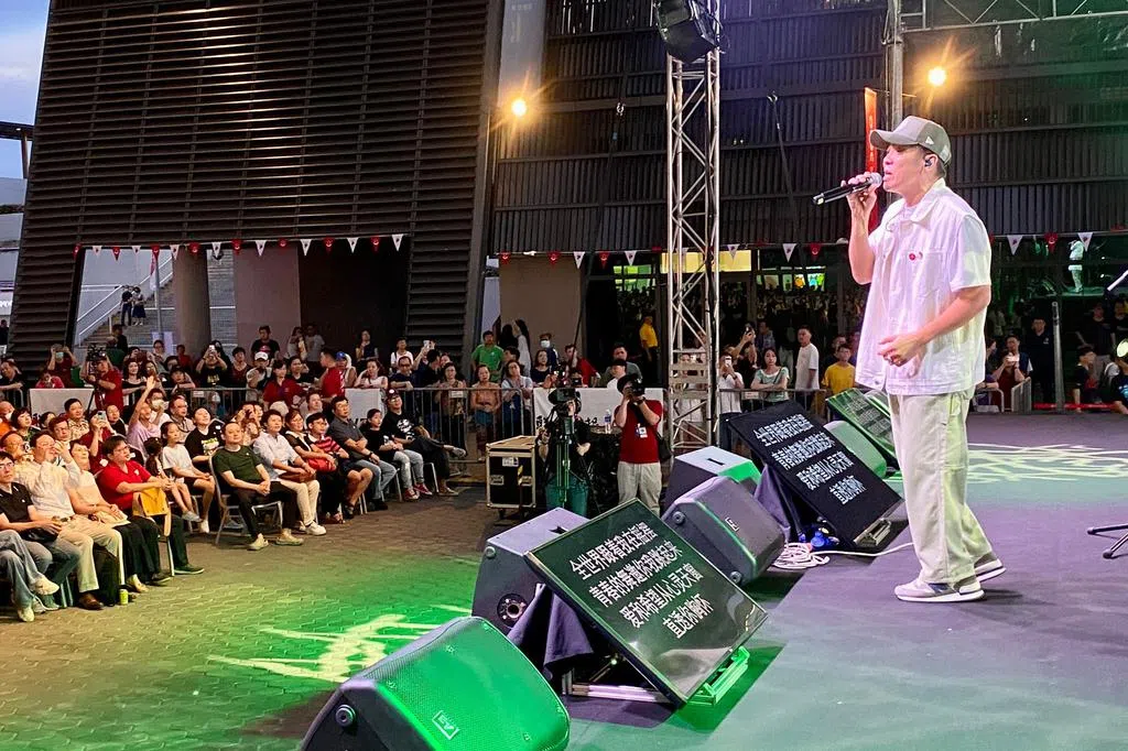 映衬着夕阳和夜空,上百名公众跟随一首首经典歌曲晃动身子,跟着大屏幕上直播的《联合早报》创刊百年“传唱百年——当新谣邂逅民歌”演唱会,哼唱着熟悉的歌词。