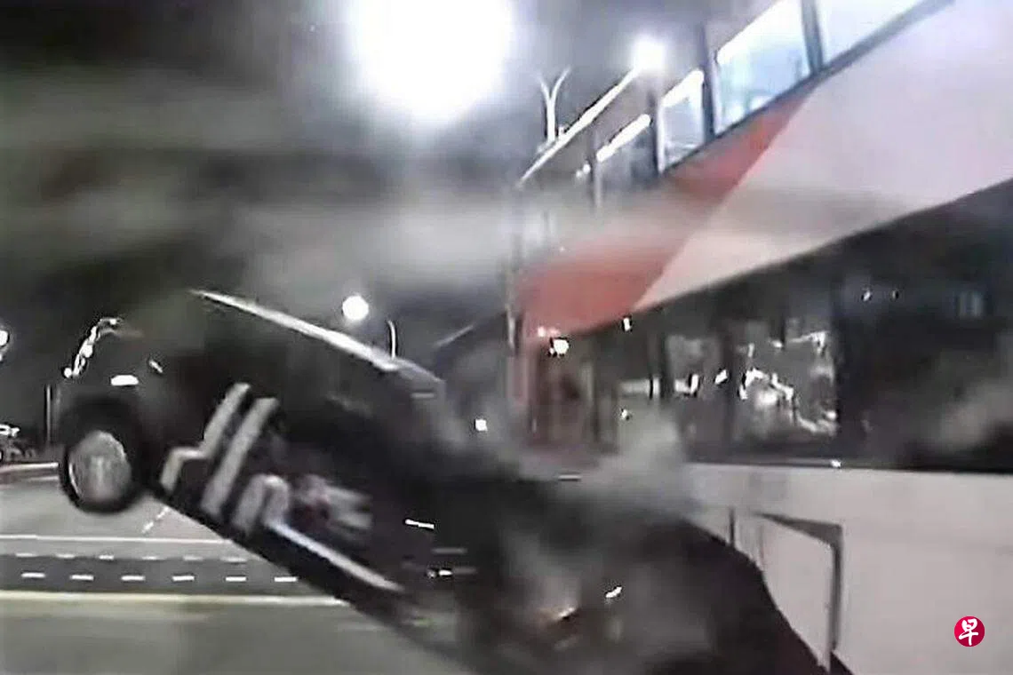 庭上播出的电眼画面显示,汽车在撞击后冒出浓烟,车头严重损坏,汽车零件散落在马路上。涉案巴士是驶过十字路口的第二辆车子。
